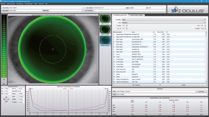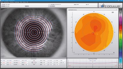 La carte topographique en couleur décrit la courbure de la surface antérieure de la cornée. Les rayons de courbure localisés sont mesurés et présentés en couleur. Les anomalies peuvent être mesurées directement depuis l‘image de la caméra. Les données les plus importantes telles que le rayon central, l‘astigmatisme, le diamètre cornéen et l‘excentricité sont affichées automatiquement.